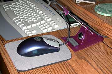 Bungee med fjäderarm som lyfter datormusens kabel från skrivbordsytan för att ge en ”trådlös” känsla.